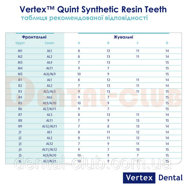 Асортимент нашої серії стоматологічних матеріалів Vertex Quint складений з метою повного задоволення повсякденних потреб фахівців із зубного протезування. Серія включає в себе 10 різних моделей чоловічих передніх верхніх зубів як квадратної, так і трикутної форми, та 4 моделі жіночих передніх верхніх зубів (пикнічний тип) і 8 передніх нижніх зубів. Додатково пропонується 9 повних комплектів верхніх і нижніх задніх зубів, з яких 7 формувальних пар мають кут жувальних бугрів між 22 і 28 градусами і 2 парі з кутом в 0 градусів.