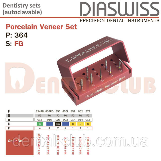 Diaswiss Porcelain Veneer Set # 364 - Набір борів для препарування під кераміні вініри (7 шт) (Діасвіс Швейцарія)